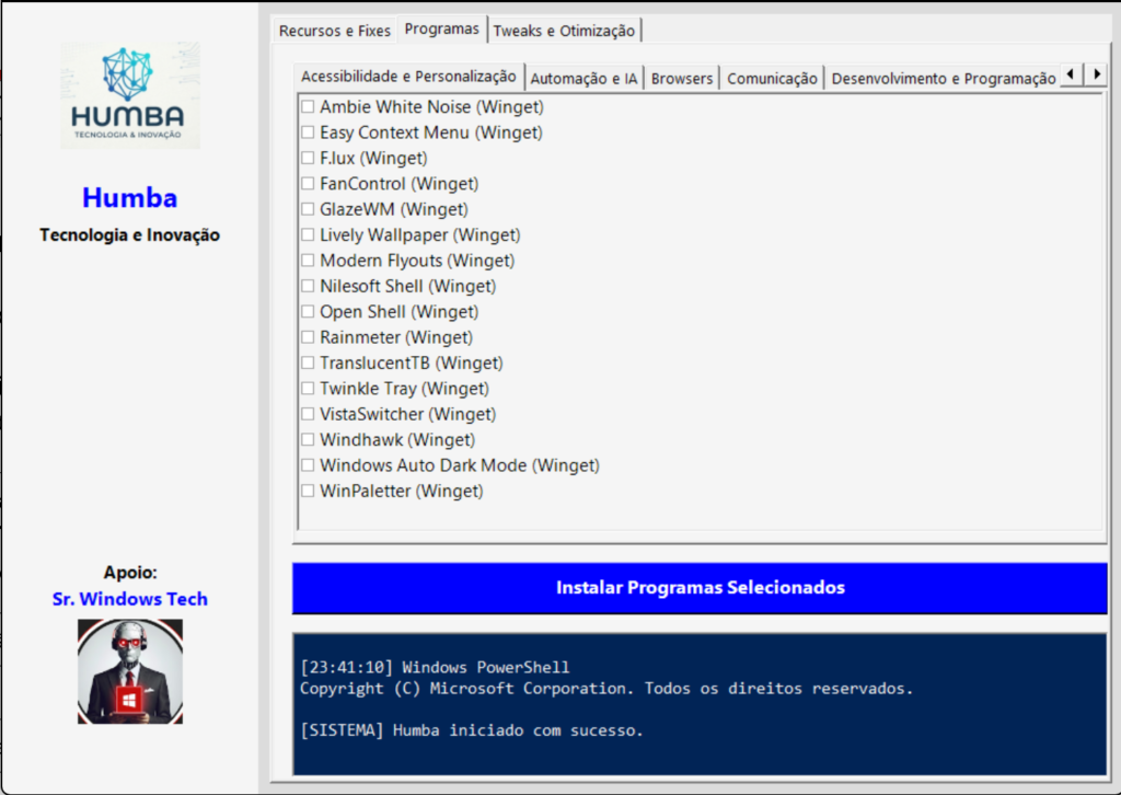 O Humba já vem com uma lista pré-definida de programas úteis, todos instaláveis via Winget (gerenciador oficial da Microsoft). As categorias incluem:
